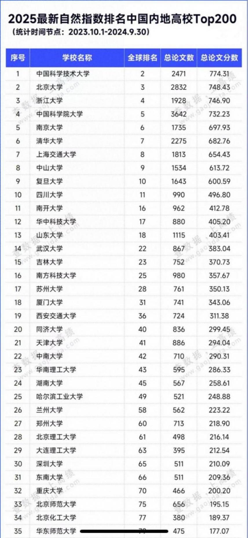就在近日,2025年全球高校最新的自然指數更新,此次更新的時間節點為2023.10.1-2024.9.30這一年的時間。由高績收集和整理了內地高校最新自然指數的TOP200榜單,在這里小編節選了前35的高校,有想要看完整版本的請移步高績的平臺。那么,就最新公布的自然指數而言,中國內地高校的表現到底是怎樣的呢?今天就讓我們一起來看看吧!