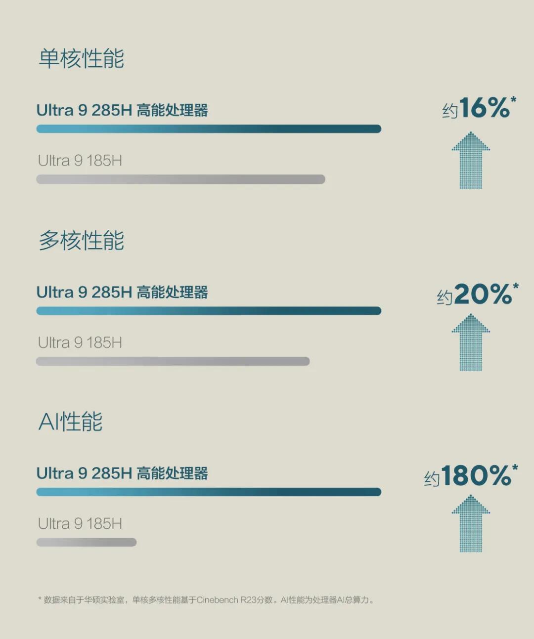 在理論性能層面,酷睿Ultra 9 285H相比上代Ultra 185H,單核性能提升16%,多核性能提升20%,圖形性能提升15%。在NPU、CPU與GPU的協同之下,可帶來高達99 TPOS的AI總算力,較之上代躍升了180%,可大幅提升本地AIGC創作效率。