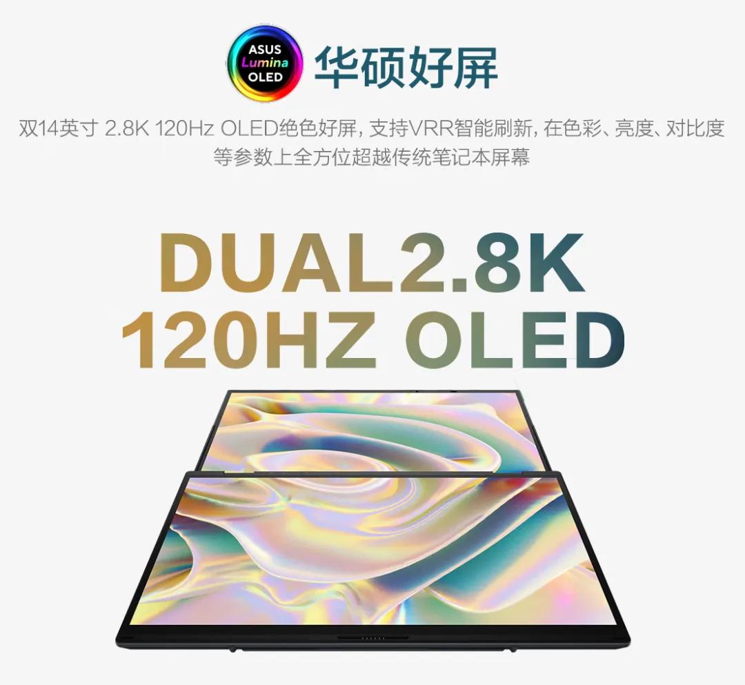 在設計和功能方面,靈耀14雙屏2025就和上代型號沒啥區別了。它的兩塊屏幕素質相同,都是2.8K分辨率,100% DCI-P3廣色域,120Hz刷新率,550nits峰值亮度,杜比視界,△E<1高色準,還通過了多種護眼認證。支持4096級壓感觸控筆和多指操作,提供更強大的生產動能與更便捷的交互體驗。