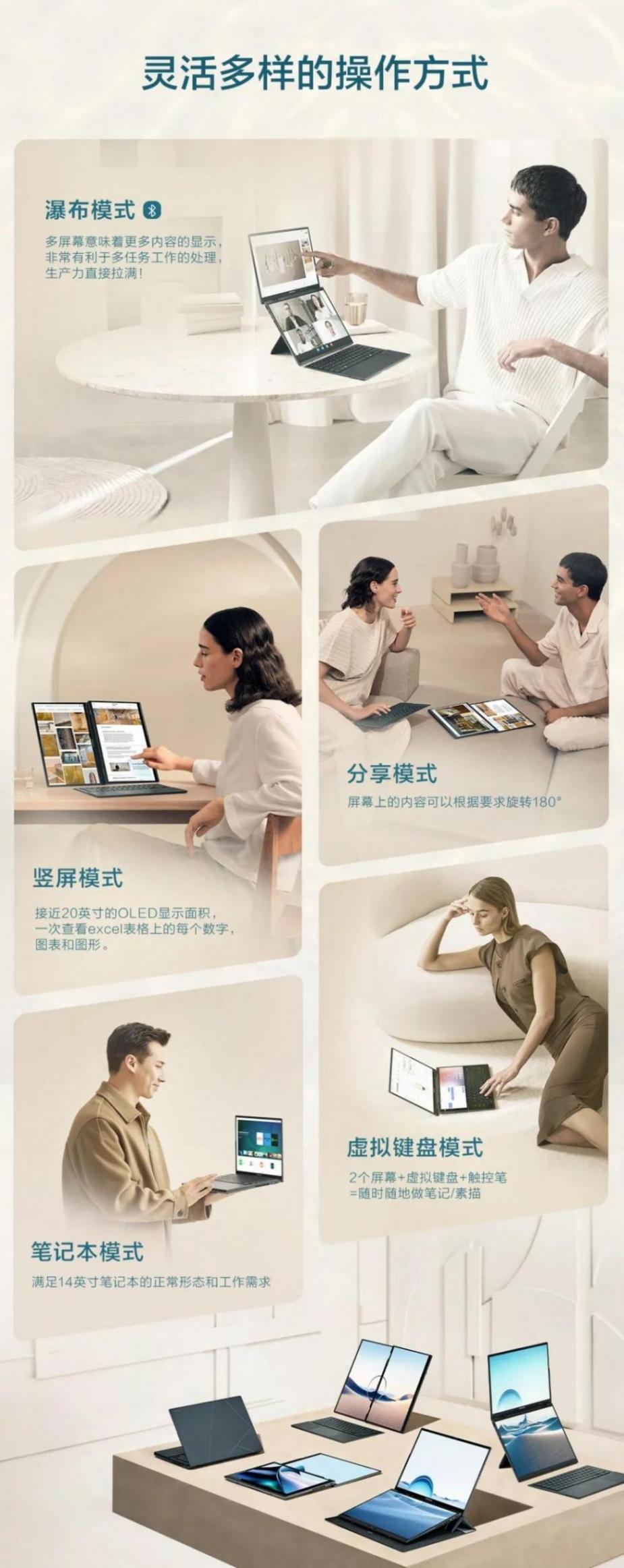 靈耀14雙屏的底蓋自帶一個可以在40~70度間開合的支架,標配了磁吸式藍牙鍵盤,二者結合,可以帶來筆記本模式、虛擬鍵盤模式、分享模式、豎屏模式以及瀑布模式等五大形態,不同模式可以匹配不同的使用場景。