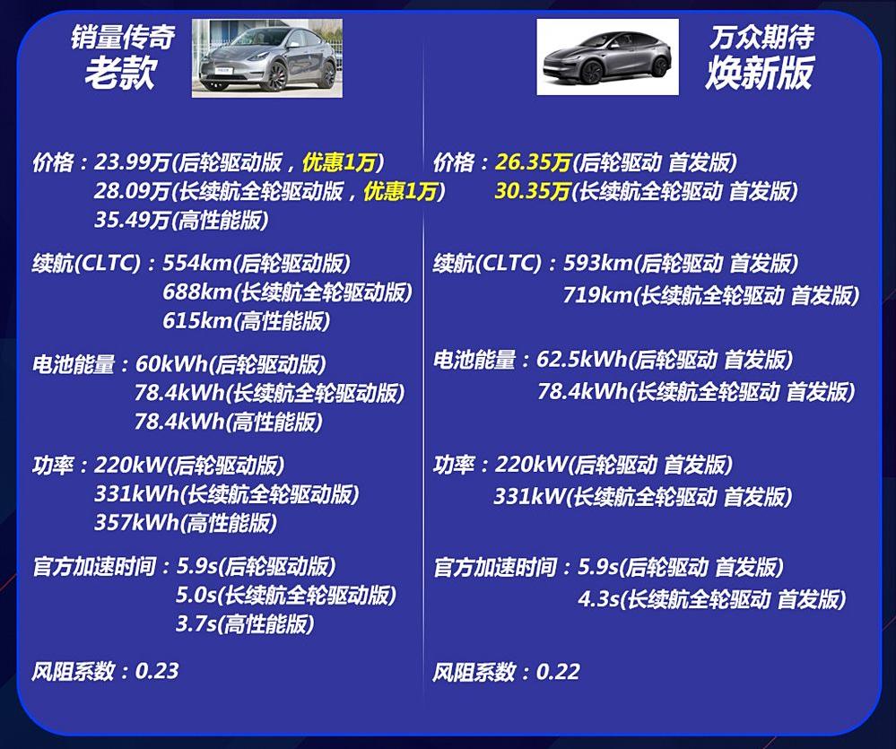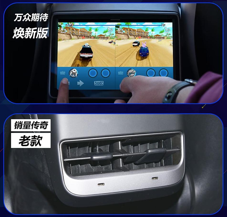 煥新版Model Y 增加了冰河藍車漆,新增了前排座椅通風,后排座椅加長了15mm并增加電動調(diào)節(jié),玻璃升級為雙層夾膠玻璃等。新車和老款Model Y相比,老款疊加優(yōu)惠后,后輪驅(qū)動版Model Y 價格低至23.99萬元,兩車相差2.36萬元;長續(xù)航全輪驅(qū)動版比老款價格貴2.06萬元。