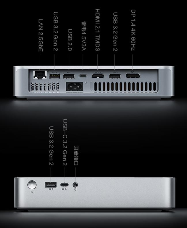 接口上有3A2C,其中一個是雷電4接口,還有DP 1.4,HDMI 2.1,以及2.5G網口。此外內置150W電源適配器,也是很高級的設計。