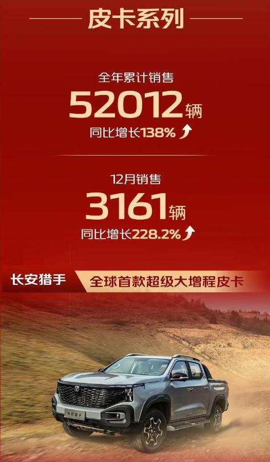 在長安凱程的幾大產品系列中,客車系列同比增長7.2%,卡車系列去年累計銷量超8.5萬輛,皮卡系列同比增長138%,累計銷量超5.2萬輛,其去年12月份的銷量同比增幅更是達到228.2%。