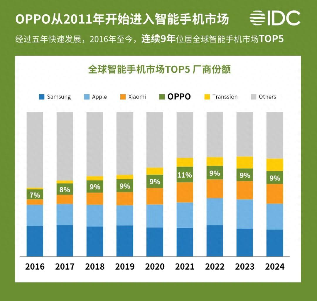 新年臨近,一眾數據評測機構也陸續公布2024年的手機市場統計數據。知名數據機構IDC就公布了2024年全球智能手機排名,其中OPPO位居TOP4,并且從2016年至今,連續9年位居全球智能手機市場前五。