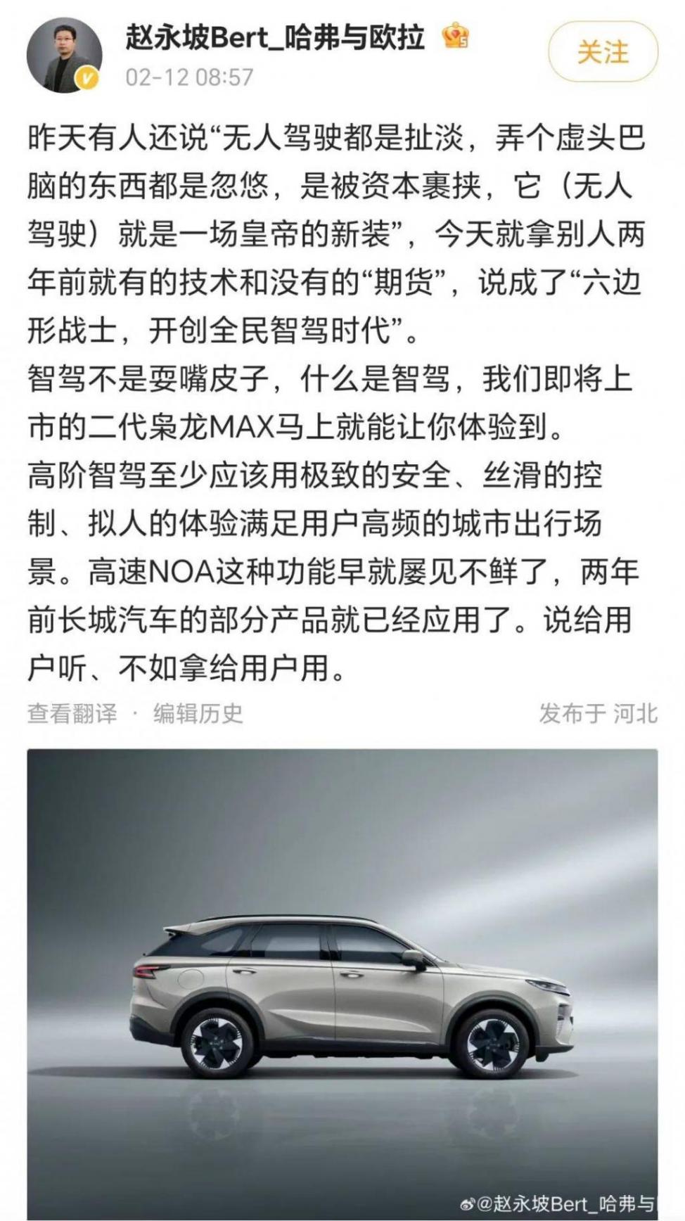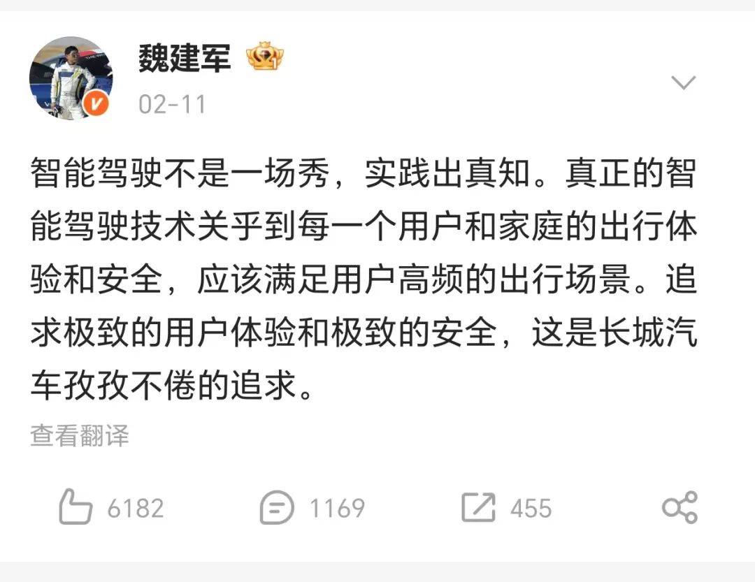 很快,長城汽車就以董事長魏建軍為首,發表了己方看法,“智能駕駛不是一場秀,實踐出真知。真正的智駕,關乎到每一個用戶和家庭的出行體驗和安全。”
