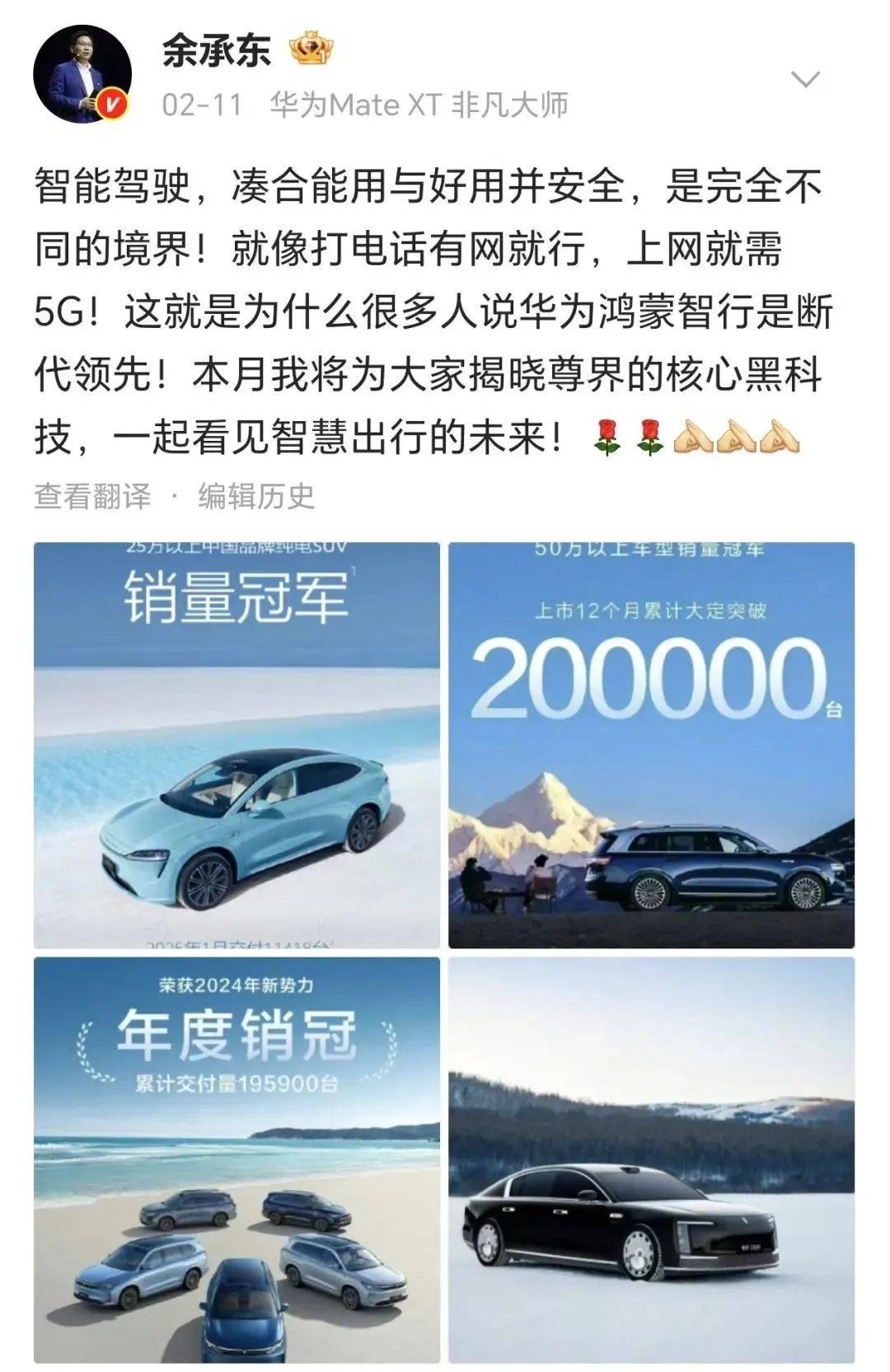 2月11日一早,余承東就開啟了大嘴模式,稱“智能駕駛,湊合能用與好用并安全,是完全不同的境界!這就是為什么很多人說華為鴻蒙智行是斷代領先!”