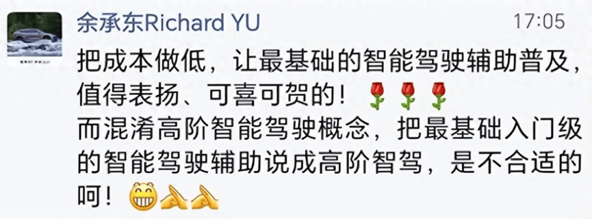 而且余承東也似乎在朋友圈再次強調:“把成本做低,讓基礎智駕普及,值得表揚、可喜可賀但混淆概念,把基礎智駕說成高階智駕,是不合適的