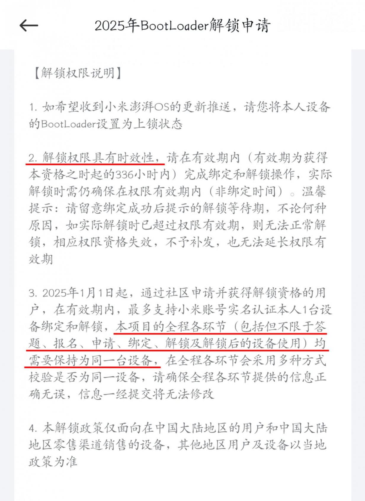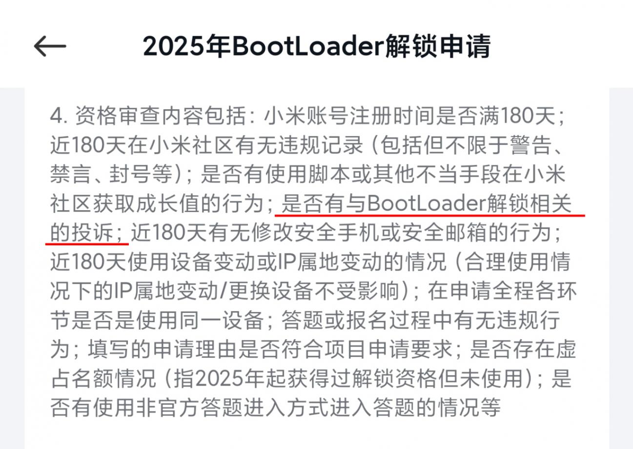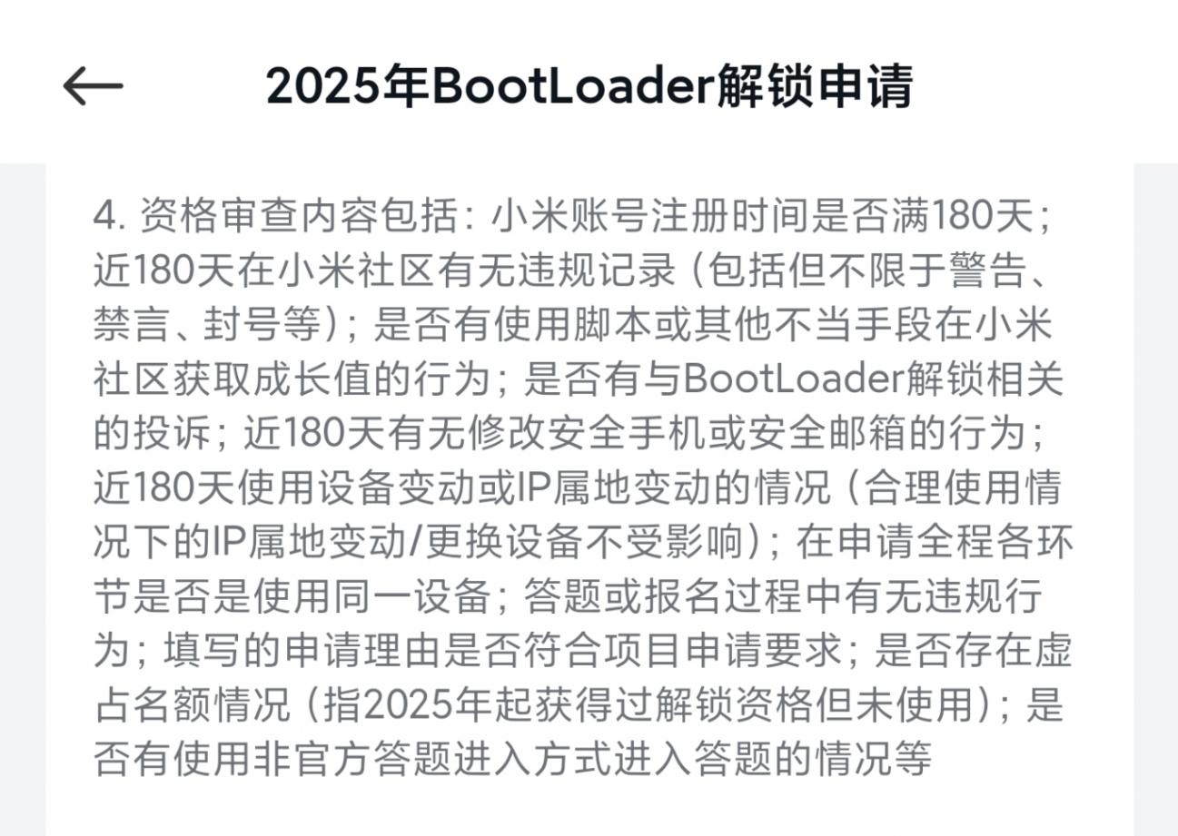 此次小米更新了 2025 解鎖 BL 申請規則,在資格審查說明中,新增了以下的一系列內容: