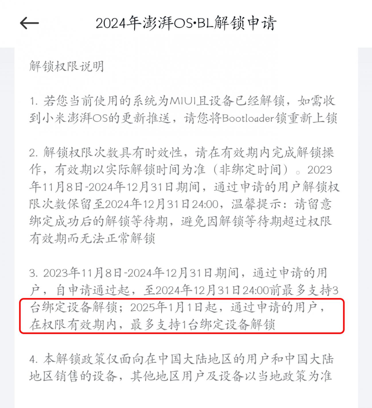 年初小米官方對澎湃 OS 手機用戶解鎖 BL 鎖規則做出調整之后,如今,再次迎來變動,進一步限制了用戶解鎖,小米手機用戶想要獲取解鎖更難了。