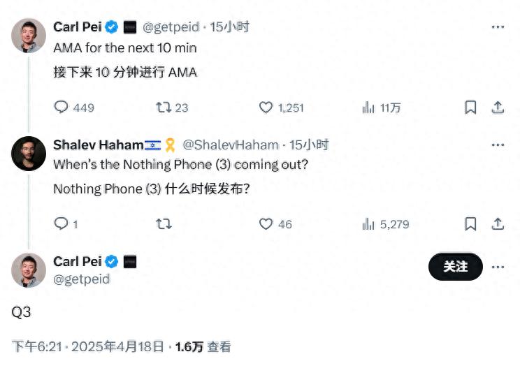 裴宇通過(guò) X 平臺(tái)舉辦了一場(chǎng)簡(jiǎn)短的 AMA 問(wèn)答,當(dāng)被問(wèn)及 Nothing Phone(3)時(shí),他表示:這款手機(jī)計(jì)劃在“第三季度”上市。IT之家發(fā)現(xiàn),此時(shí)間點(diǎn)大致與三星下一代折疊屏手機(jī)、谷歌新款 Pixel 系列以及新 iPhone 接近。參考 Phone(2)在 2023 年 7 月中旬登場(chǎng)的節(jié)奏,Phone(3)很有可能會(huì)在第三季度的前段時(shí)間亮相。