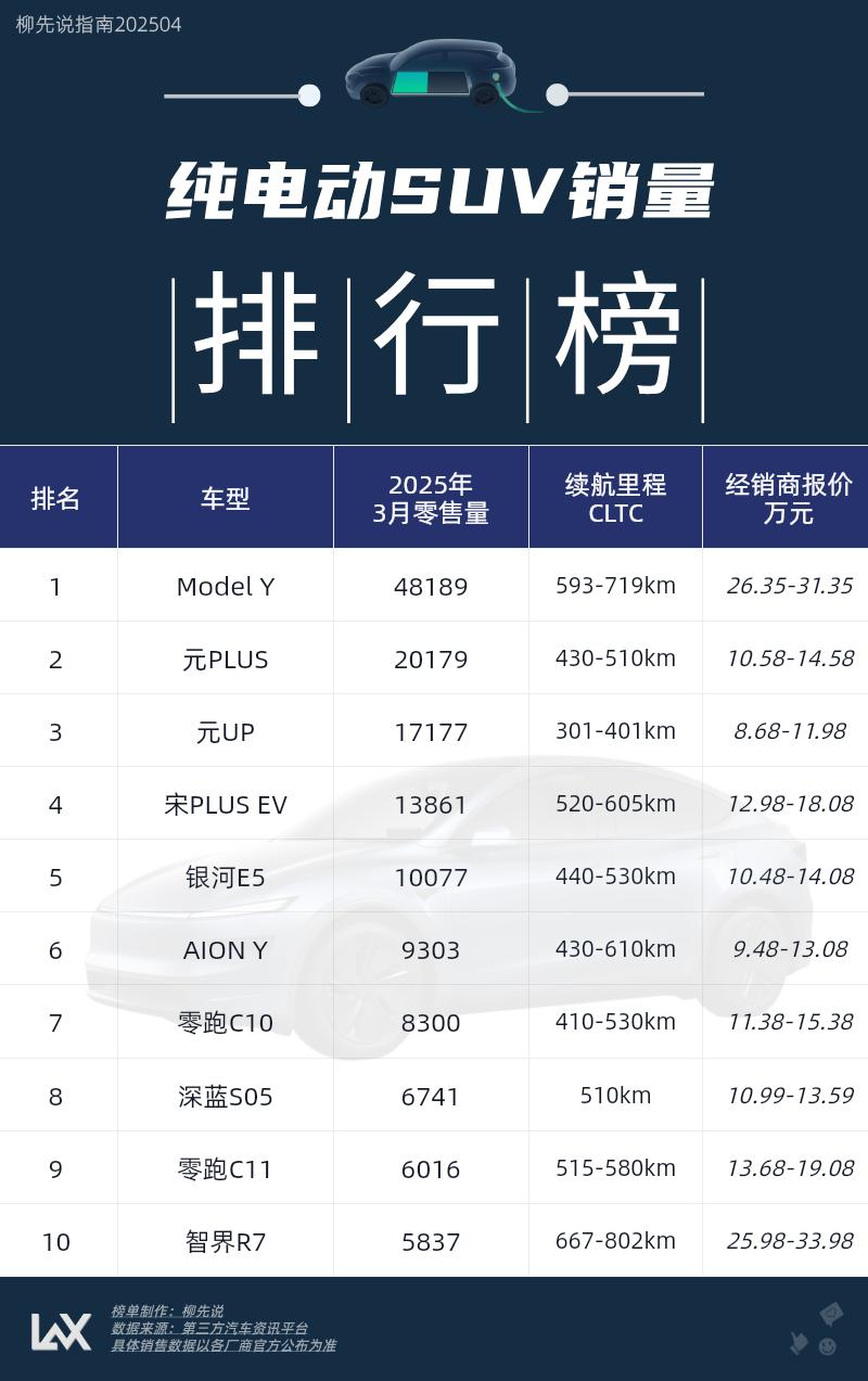 榜單前5名:Model Y、元PLUS、元UP、宋PLUS EV和銀河E5。特斯拉Model Y位居榜首,今年3月零售量達到48189輛,CLTC續航里程593-719km。Model Y銷量回升的原因,很大程度上得益于其煥新版的推出。而且其市場策略也得到了精心調整,以更好地滿足消費者需求和應對日益激烈的市場競爭。