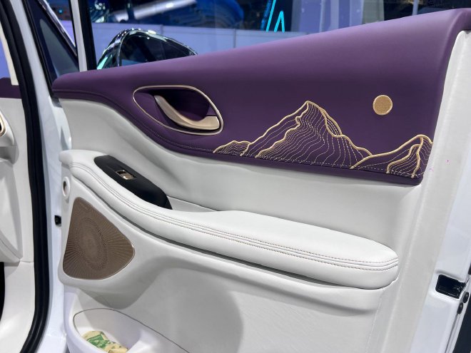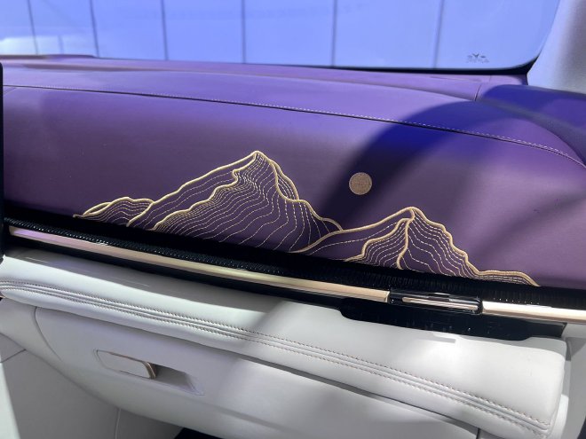 副駕駛前,以及車門飾板都刻畫著山河刺繡,非常有中國山水畫的境界。