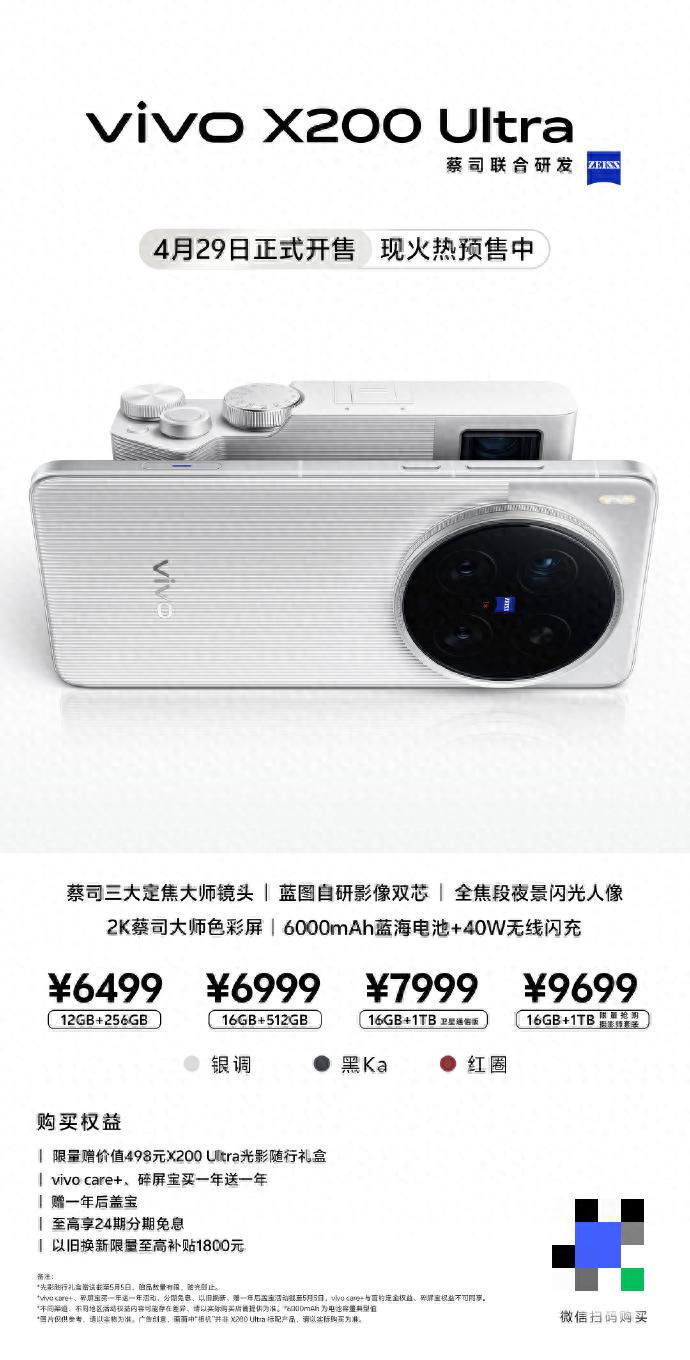 目前vivo X200 Ultra已在京東開啟預(yù)售。現(xiàn)在打開京東APP,來京東新品買vivo X200 Ultra,可享受24期白條免息、以舊換新至高補(bǔ)貼1800元,限量還有多重權(quán)益隨心選,光影隨行禮盒、vivo定制服務(wù)包等隨心選,快來搶購,先到先得!