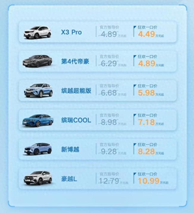 4 月 28 日消息,吉利今日宣布,2025 年 4 月 29 日-5 月 5 日,購買睿藍 X3 PRO、第 4 代帝豪、繽越超能版、繽瑞 COOL、新博越、豪越 L 可享狂歡一口價。
