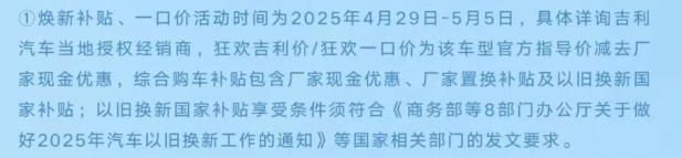 官方表示,狂歡吉利價 / 狂歡一口價為該車型官方指導價減去廠家現(xiàn)金優(yōu)惠,綜合購車補貼包含廠家現(xiàn)金優(yōu)惠、廠家置換補貼及以舊換新國家補貼;以舊換新國家補貼享受條件須符合《商務部等 8 部門辦公廳關于做好 2025 年汽車以舊換新工作的通知》等國家相關部門的發(fā)文要求。