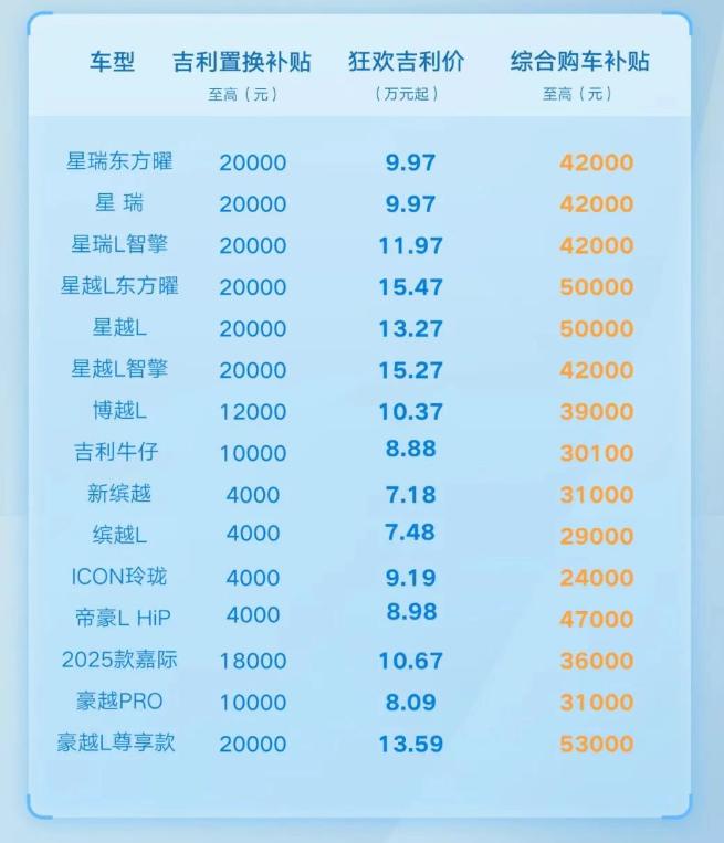 此外,吉利星瑞東方曜、星瑞、星瑞 L 智擎、星越 L 東方曜、星越 L 等車型推出“狂歡吉利價”活動,可享受綜合購車補貼。
