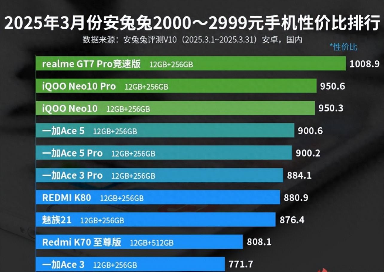 具體來說,在2025年3月份安兔兔2000—2999元手機性價比排行榜中,realme GT7 Pro競速版和iQOO Neo10 Pro分列第一名和第二名。在安兔兔平臺上,這兩款智能手機的性價比評分分別為1008.9分和950.6分。其中,在核心配置上,真我GT7Pro競速版搭載了驍龍8至尊處理器,這款處理器采用了先進的制程工藝,具備超強的運算能力和圖形處理能力。無論是運行大型游戲還是多任務處理,都能輕松應對,為用戶帶來流暢的使用體驗。