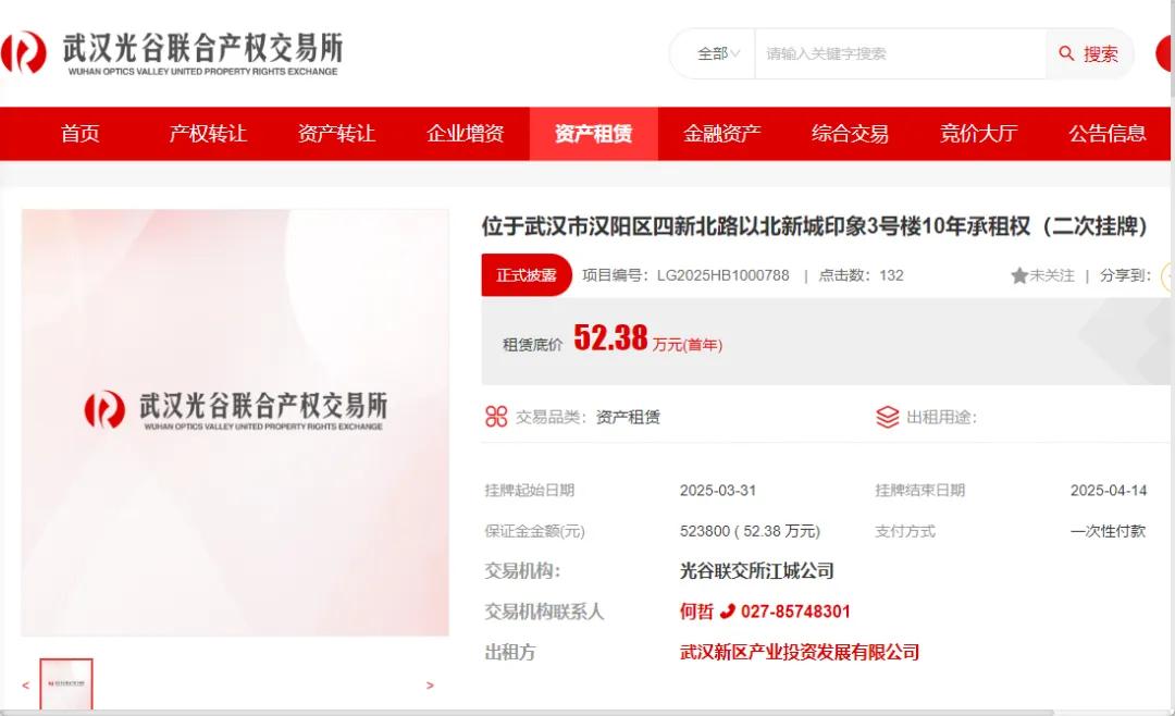 為避免長期閑置,確保國有資產(chǎn)保值增值,武漢城投新區(qū)公司連續(xù)兩年將其納入重點資產(chǎn)盤活計劃進行攻堅。公司委托所屬產(chǎn)投公司深入開展周邊市場調(diào)查,多方發(fā)布招租信息,密集洽談教培、公寓、民宿等行業(yè)意向承租人,擇優(yōu)完善招租條件。按照國有資產(chǎn)出租管理制度,抓緊完成評估等系列工作,今年4月,在光谷聯(lián)合產(chǎn)權(quán)交易所成功掛牌。掛牌租賃底價為52.38萬元(首年),后期租金每3年遞增5%。