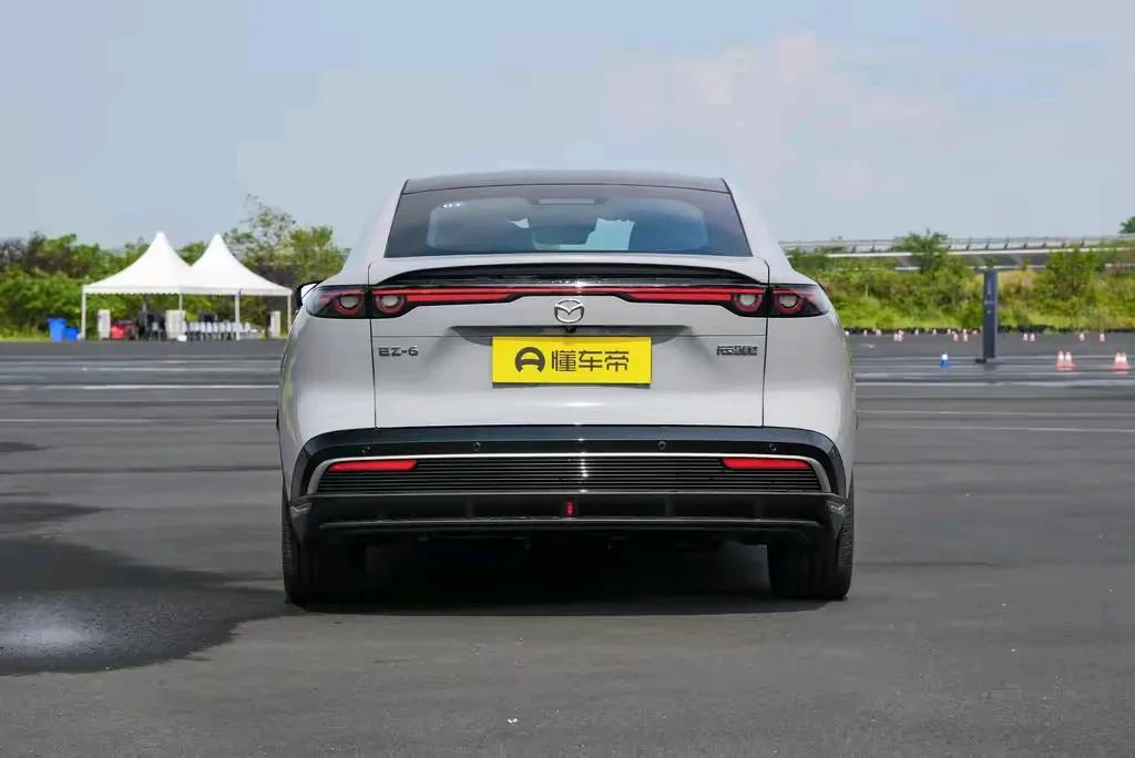 而馬自達EZ-6在外觀方面則延續了品牌經典的“魂動”設計語言,并巧妙地將優雅與動感融合在一起。從前面看,車頭的大尺寸進氣格柵搭配鍍鉻裝飾條,極具視覺沖擊力。兩側銳利的大燈組與進氣格柵相連,形成一個整體感十足的前臉,讓人過目難忘。再看車身側面,線條流暢且富有張力,曲面的巧妙運用,讓車子仿佛隨時準備“起跑”,充滿了蓄勢待發的姿態。它的長寬高分別為4921mm、1890mm、1485mm,軸距為2895mm,尺寸同樣不小。從車尾看,獨特的豎式尾燈設計十分吸睛,搭配下方雙邊共兩出的排氣布局,既展現出運動風格,又不失優雅氣質。
