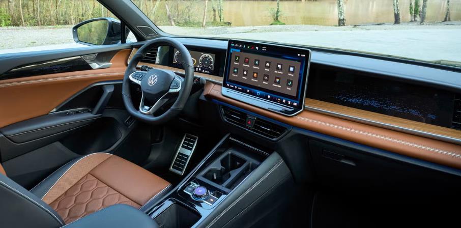 途觀的內(nèi)飾沿襲了大眾近年來的設(shè)計(jì)語言,質(zhì)感顯著提升。座艙內(nèi)遍布縫線裝飾,硬朗線條被柔和的有機(jī)形態(tài)取代。材質(zhì)觸感上乘,種類比上代更豐富。得益于將換擋機(jī)構(gòu)移至方向盤后方(現(xiàn)為類似ID.Buzz的短小撥桿),中控臺(tái)得以擴(kuò)大并更實(shí)用。