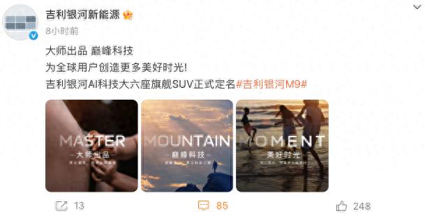 近日,吉利銀河官方宣布,旗下全新大型旗艦SUV正式定名為——吉利銀河M9。官方解釋,“M”代表Master(大師品質)、Mountain(巔峰科技)和Moment(為用戶創造美好時光),寓意新車在品質、AI科技和智能座艙方面值得期待。