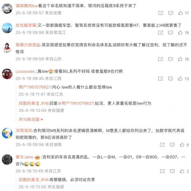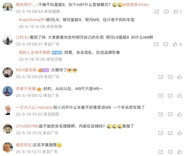 從命名方式來看,目前國內多家車企均采用數字“9”代表品牌旗艦或尺寸較大的產品命名,包括領克900、極氪9X、問界M9、深藍S09、樂道L90、傳祺S9等,吉利銀河新車似乎也是遵循了這一“傳統”理念。不過,對于新車的命名,不少網友認為吉利新車命名混亂;也有網友認為:“命名自有人家的考量,沒必要過分解讀吧,賣得好就行。”