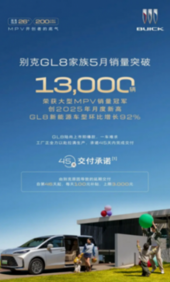 6月3日消息,別克品牌宣布,GL8家族5月銷量突破13000輛,獲得大型MPV銷量冠軍。