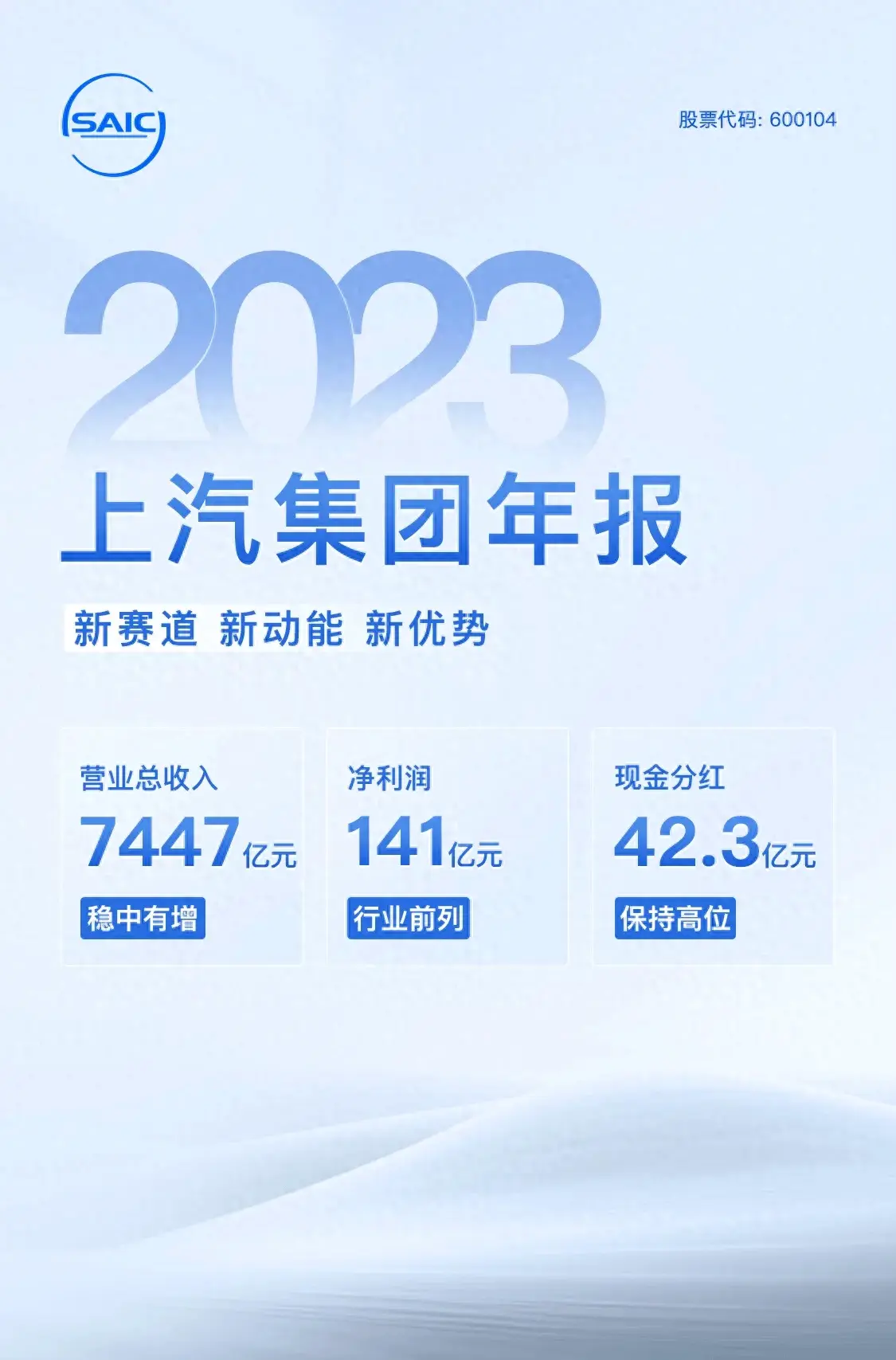 近日,上汽集團發布 2023 年年度報告。 報告期內, 公司實現營業總收入 7447 億元, 穩中有增; 實現歸屬于上市公司股東的凈利潤 141 億元,保持行業領先;現金分紅42.3億元,持續保持高位,在整個汽車行業中首屈一指。