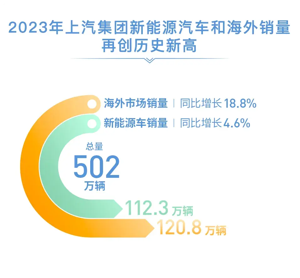 2023年,上汽集團自主品牌、 新能源、 海外業務新三駕馬車強勢發力, 全年銷售整車 502. 1 萬輛, 連續18 年保持國內第一; 其中, 自主品牌 整車銷售 277. 5 萬輛, 占公司銷量比重超過 55% ; 新能源汽車銷售 112. 3 萬輛, 繼續位居全球行業新能源車銷量頭部陣營; 海外市 場 銷售 120. 8 萬輛, 連續 8 年保持整車出口國內行業第一。