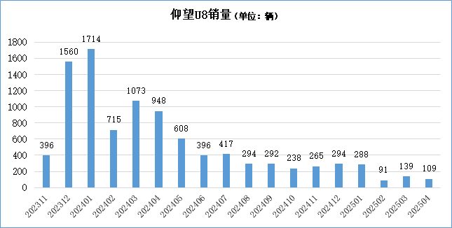 交強險數據顯示,仰望U8自2023年11月開始有批量交付上險記錄,隨后在接下來的兩個月上險量都創出新高,2024年1月上險量達到1714輛,但此后就一路走低,2025年2月已不足百輛。這說明在最初幾個月交付了累積的訂單之后,穩態訂單量比較有限。