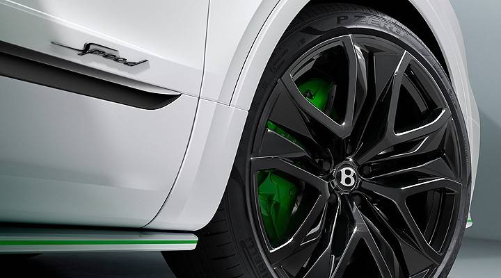 外型設(shè)計(jì)方面,新世代 Bentayga Speed 則是換上了「黑化」的車身飾件、水箱護(hù)罩外框與內(nèi)部格網(wǎng)、下擾流格網(wǎng)、廠徽、頭/尾燈燈框、窗框、亮面黑/消光黑的 Speed 車頂 (選配) 與行李架,且于車門下緣嵌有黑色的草寫「Speed」車型銘牌,并標(biāo)配 22 吋的黑色或銀色輪圈,搭配擁有 7 種顏色的剎車卡鉗,且首度提供亮面黑/消光黑與灰色的 23 吋 10 輻式 Speed 輪圈供消費(fèi)者選配。