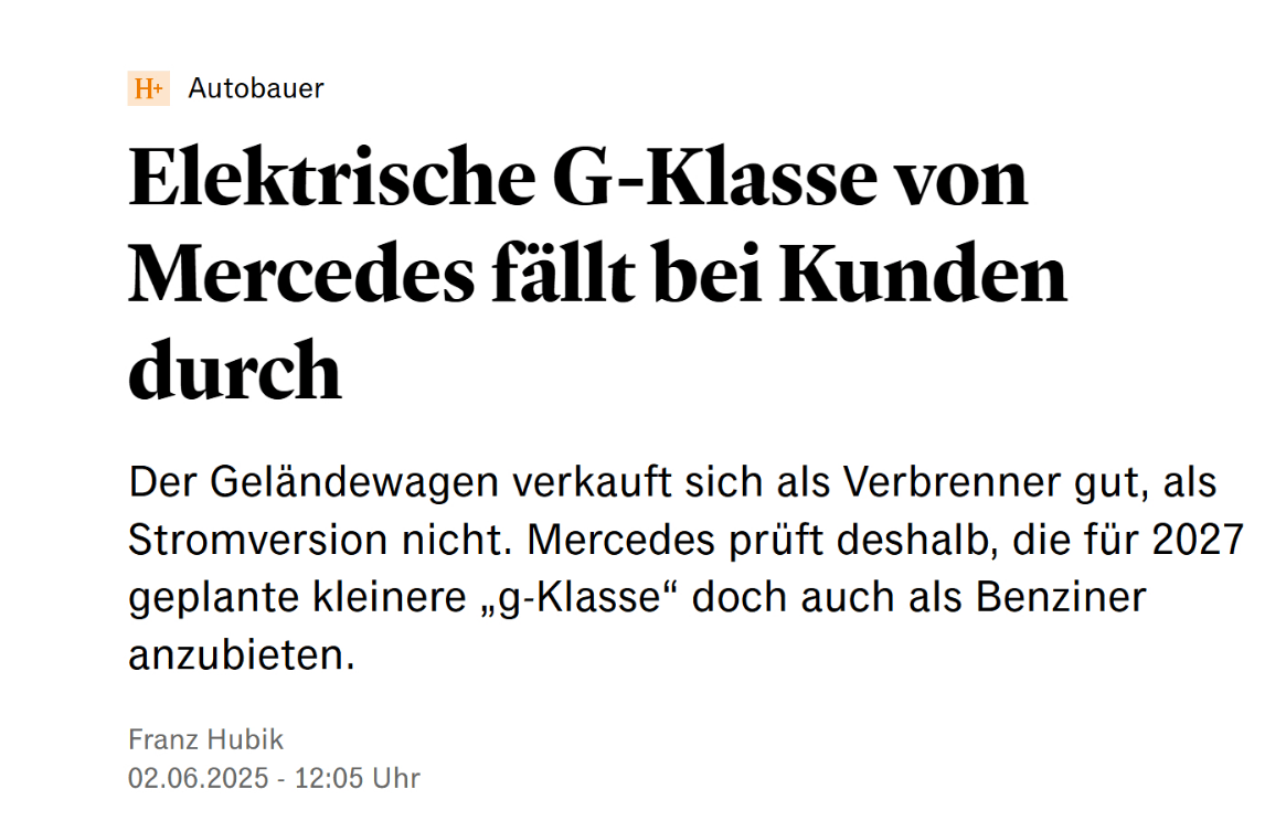 據《德國商報》報道,去年9月,上市不久的奔馳純電G級越野車注冊了32輛。截至2025年4月底,純電“大G”在整個歐洲售出1,450輛。相比之下,同期燃油版G級越野車的銷量則高達約9,700輛,幾乎是純電版的七倍。
