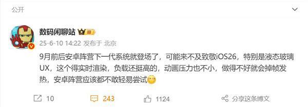 他還表示,iOS 26的液態玻璃設計需要實時渲染,負載挺高,動畫壓力也不小,做得不好就會掉幀發熱,安卓廠商應該不敢輕易嘗試。