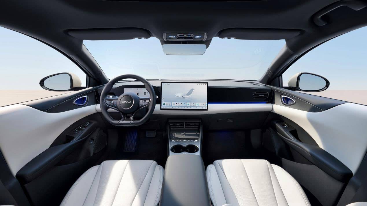 走進車內,能感受到濃郁的科技與舒適氛圍。中控臺帶有貫穿黑色飾板,質感十足。8.8英寸全液晶儀表采用嵌入式設計,與HUD抬頭顯示系統相配合,讓駕駛者隨時掌握車輛信息。最高配備的15.6英寸中控屏,顯示清晰,操作流暢,全系搭載智能座艙高階版-DiLink100,支持動態壁紙、地圖雙桌面、全場景智能語音、3D控車等功能,就像把一個智能移動終端裝進了車里。三輻式D型方向盤握感舒適,懷擋式換擋機構操作便捷,左后方還配備有駕駛輔助功能撥片。副儀表臺設有手機無線充電面板,方便為手機充電;頂配車型在中央扶手箱內部配備的車載冰箱,最低可制冷至零下6攝氏度,最高能制熱到50攝氏度,車輛下電后還支持最高12小時延時工作,無論是夏日的冷飲,還是冬日的熱飲,它都能輕松滿足。前排的一體式運動座椅采用皮質材料包覆,不僅顏值高,還支持通風、加熱功能,讓駕乘者四季都能舒適出行;后排座椅可4/6比例放倒,大大擴展了后備廂儲物空間,日常購物、長途旅行都不用擔心空間不足。此外,車輛還配備了容量可觀的前備廂、全景天窗、車內氛圍燈、360度全景影像等配置,全方位提升駕乘體驗。