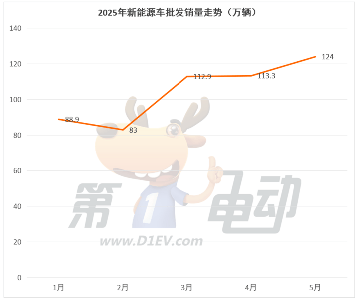 乘聯會預估,5月全國新能源乘用車廠商批發銷量124萬輛,同比增長38%,環比增長9%。綜合預估今年1-5月累計批發銷量522萬輛,同比增長41%。
