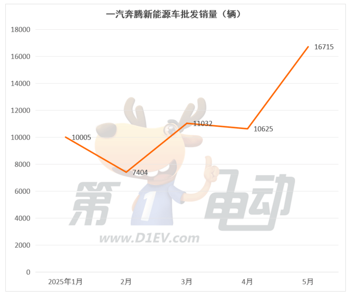 一汽奔騰5月銷量達1.6萬輛,環比上漲57%,同比暴漲超7倍,創新高。從2025年開始,一汽奔騰便進入榜單前20。