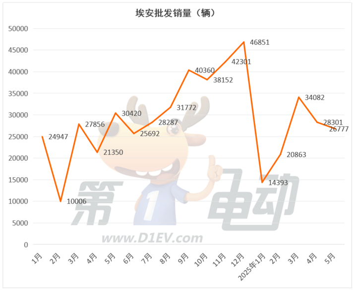 2024 年廣汽埃安全年銷量就已出現大幅下滑,銷售新車 37.49 萬臺,同比減少 21.90%。2025 年前 5 個月累計銷售 12.44 萬臺,逆勢下降 12.6%。