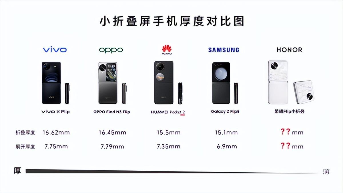 目前在售的小折疊屏手機(jī)折疊起來后厚度大約在15mm-17mm之間,我們預(yù)計榮耀Flip小折疊將在厚度上帶來更多驚喜。