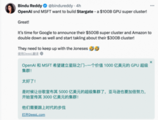 所有即將實施的項目加在可能耗資約1150億美元,這是目前一些最大數據中心成本的100倍,花費將由微軟買單。目前微軟每年在Azure數據中心、芯片和網絡設備上的花費約為500億美元。