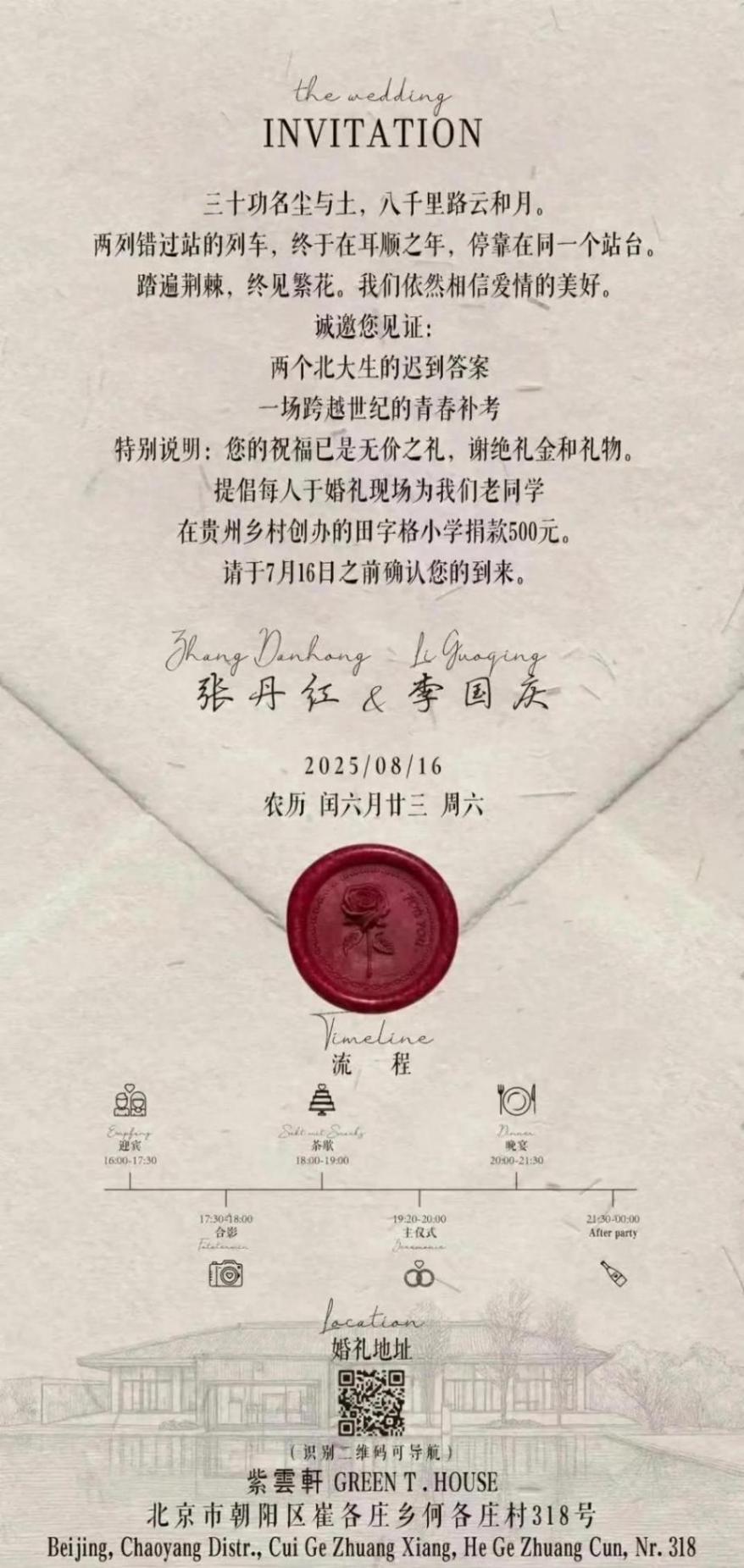 請柬里特別說明捐款給貴州的田字格小學,可能跟他們之前做過的公益有關。以前李國慶創業失敗過,自己投錢做早晚讀書app,現在說要搞ai應用。