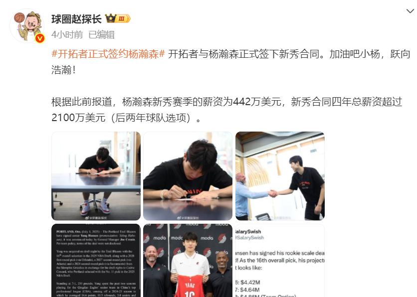 千呼萬喚始出來,來自NBA的最新消息,開拓者已經正式官宣簽下男籃20歲天才中鋒楊瀚森。在首輪第16順位被開拓者選中后,楊瀚森成為了中國男籃歷史上第三位首輪秀,僅次于姚明和易建聯般的存在。據悉,這一次楊瀚森與開拓者簽下了一份4年超過2100萬的新秀合同。在正式與開拓者簽約以后,楊瀚森也成為了男籃歷史上第8位征戰NBA的球員,而他的第一年年薪就達到442萬美元,折合人民幣約為3160萬元。
