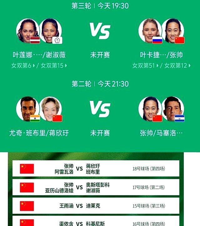 張帥今晚要忙壞了——同時打女雙和混雙兩場比賽,目標都是沖8強。