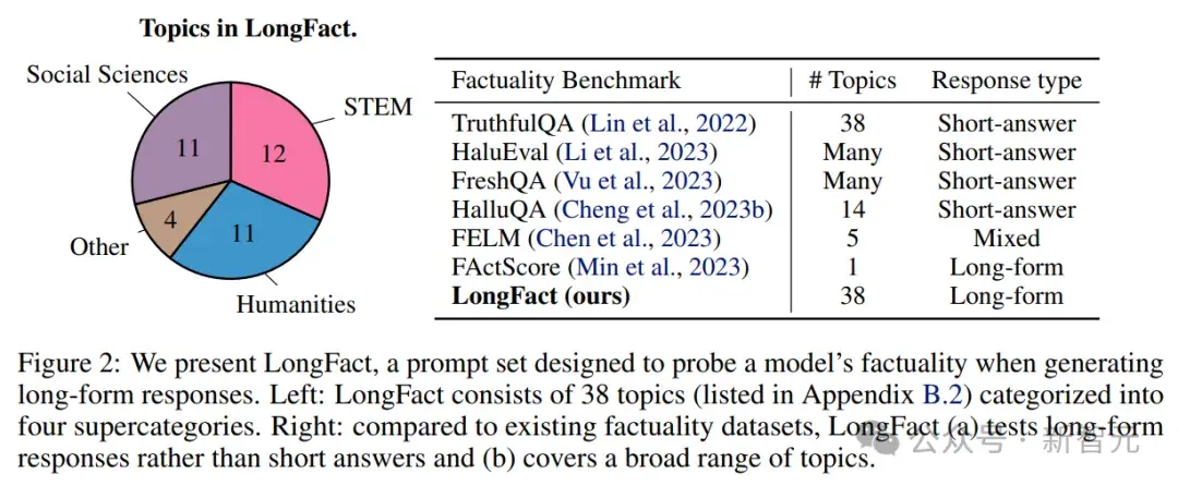 為了對大模型的長篇回答進行事實性評估和基準測試,研究人員首先使用GPT-4生成LongFact,這是一個包含數千個問題的提示集,涵蓋38個主題。