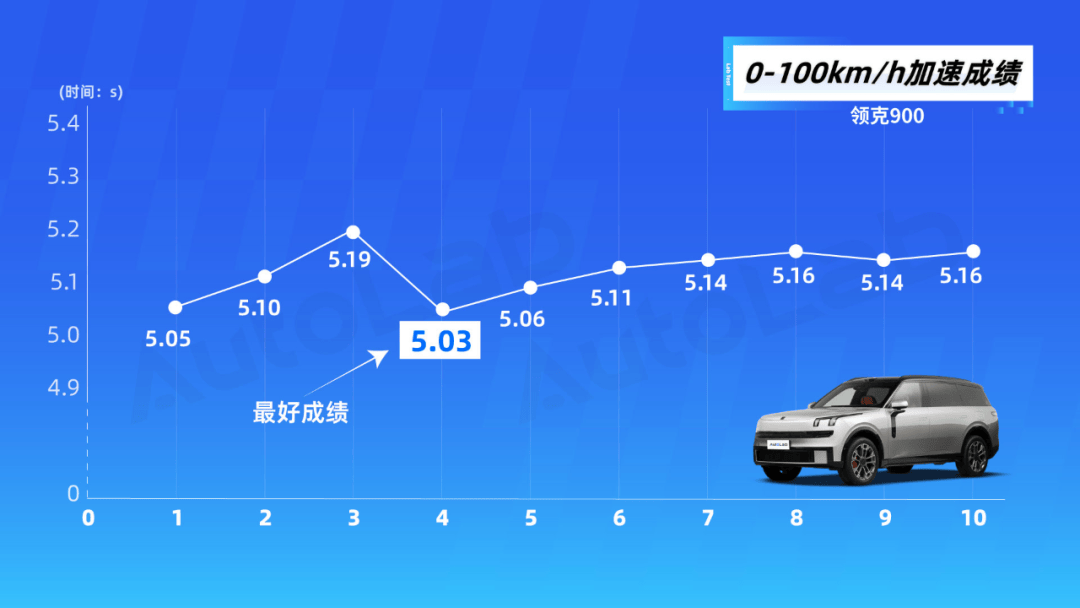 說明在這樣的高強度連續測試后,領克900的電機功率出現了一定程度衰減,但是幅度算不上明顯,畢竟最快與最慢之間的差距甚至不到0.2s,幾乎可以忽略不計。