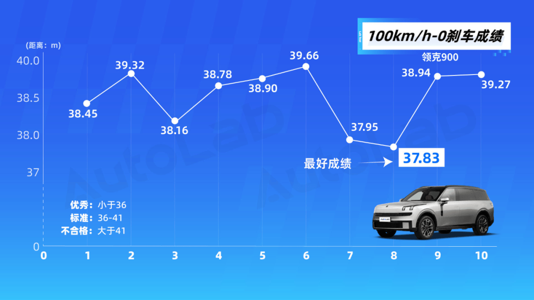 通過折線圖也能明顯看出,領克900在剎車方面的衰減幅度并不大,最好與最差成績之間的差距僅為1.83米,大概是三分之一個車身的長度。