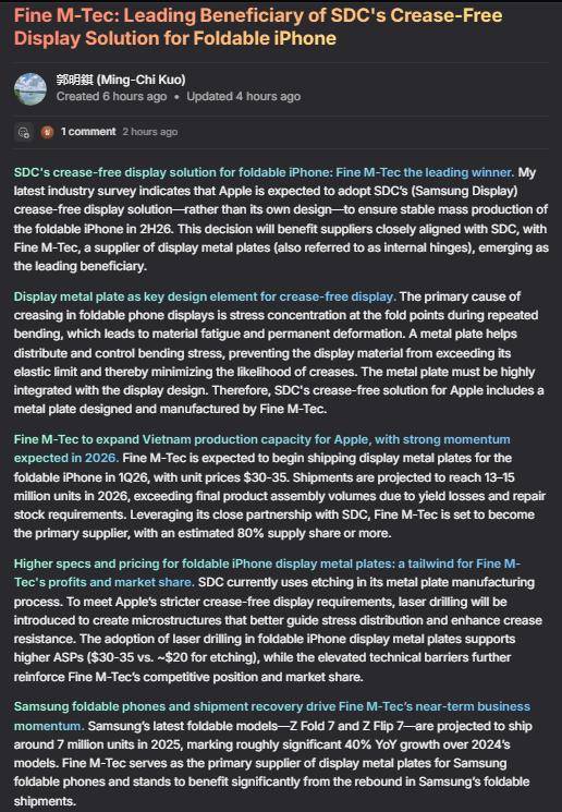 郭明錤還表示,Fine M-Tec 預(yù)計將于2026年第一季度開始出貨折疊iPhone用顯示器金屬板。該金屬板的單價約為30-35美元,2026年的出貨量預(yù)計達(dá)到1300萬至1500萬個。
