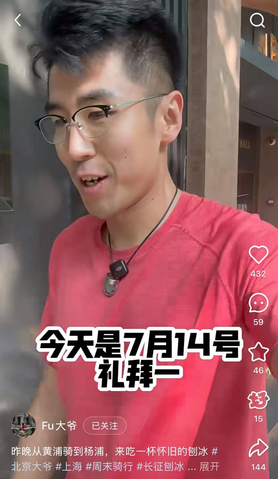 咖啡館里,博主于夫放下手機,在小紅書和視頻號上傳了一段最新視頻。以“我是常住上海的老北京”為習慣開場,“Fu大爺”從黃浦騎行到楊浦濱江,就為了體驗一口全上海最老牌的紅豆刨冰。