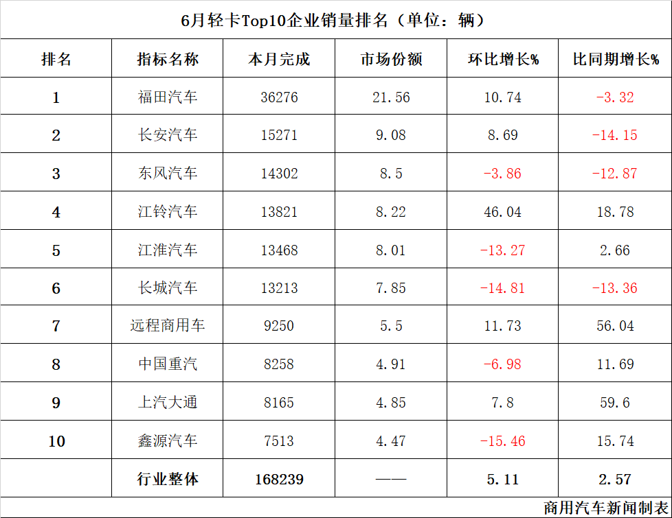 其中,輕卡6月銷量為16.82萬輛,環比增長5.11%,同比增長2.57%;1~6月累計銷售103.58萬輛,累計同比增長6.69%。