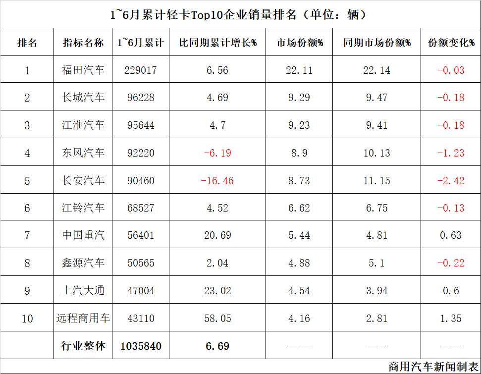 上半年輕卡累銷103萬輛!福田穩坐第一,遠程/大通/重汽增幅明顯