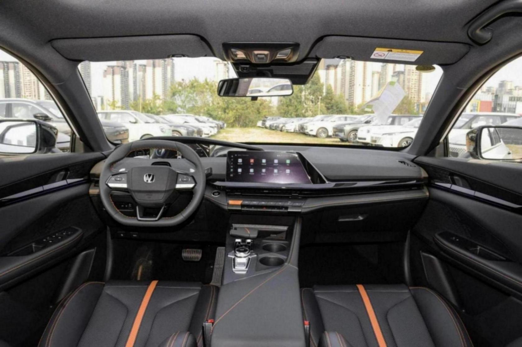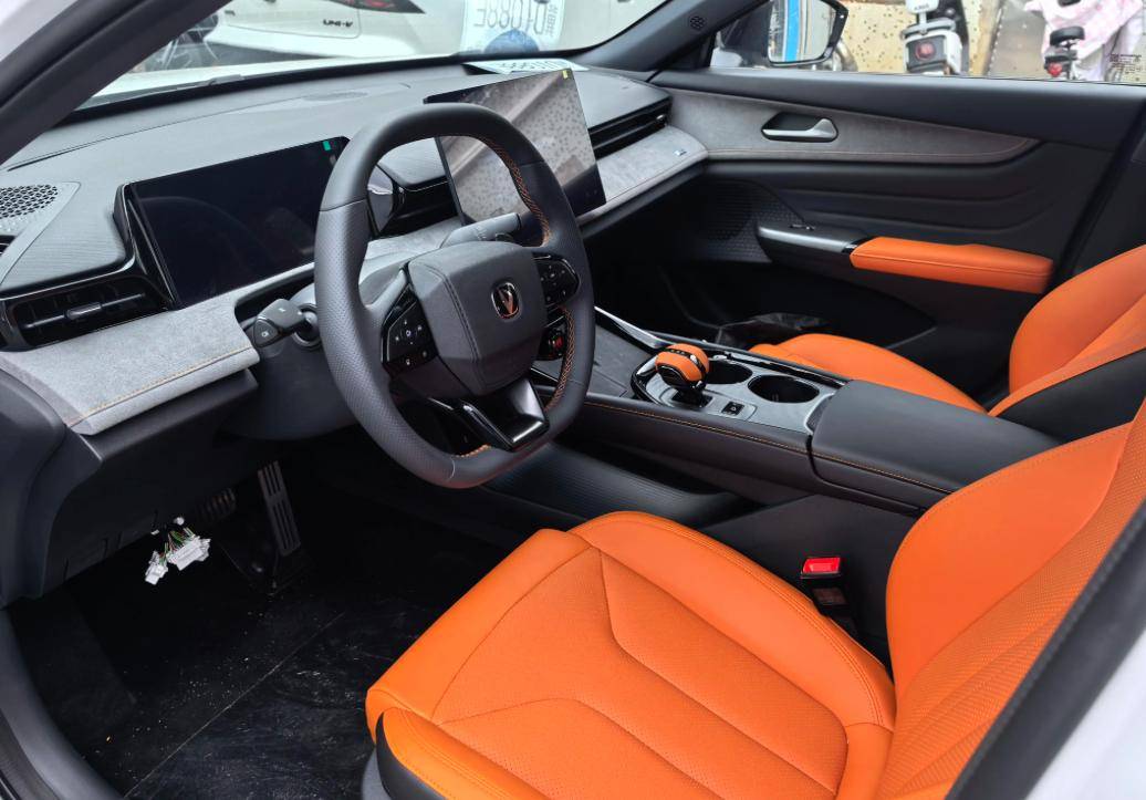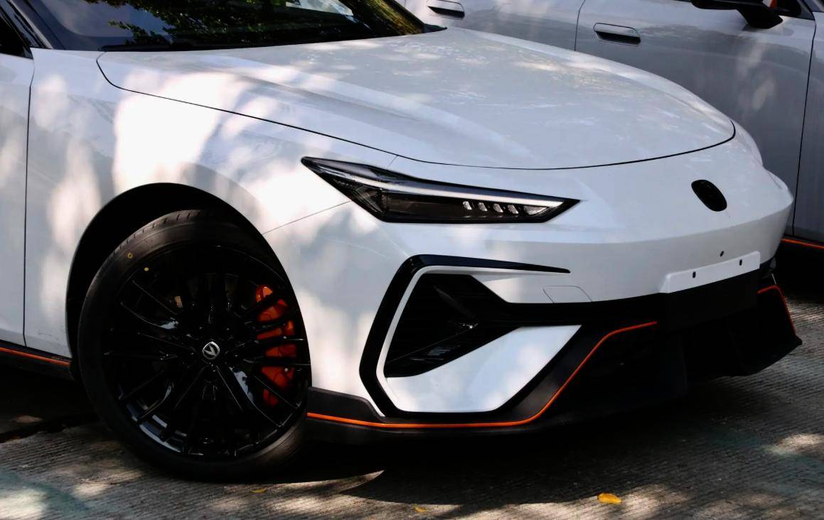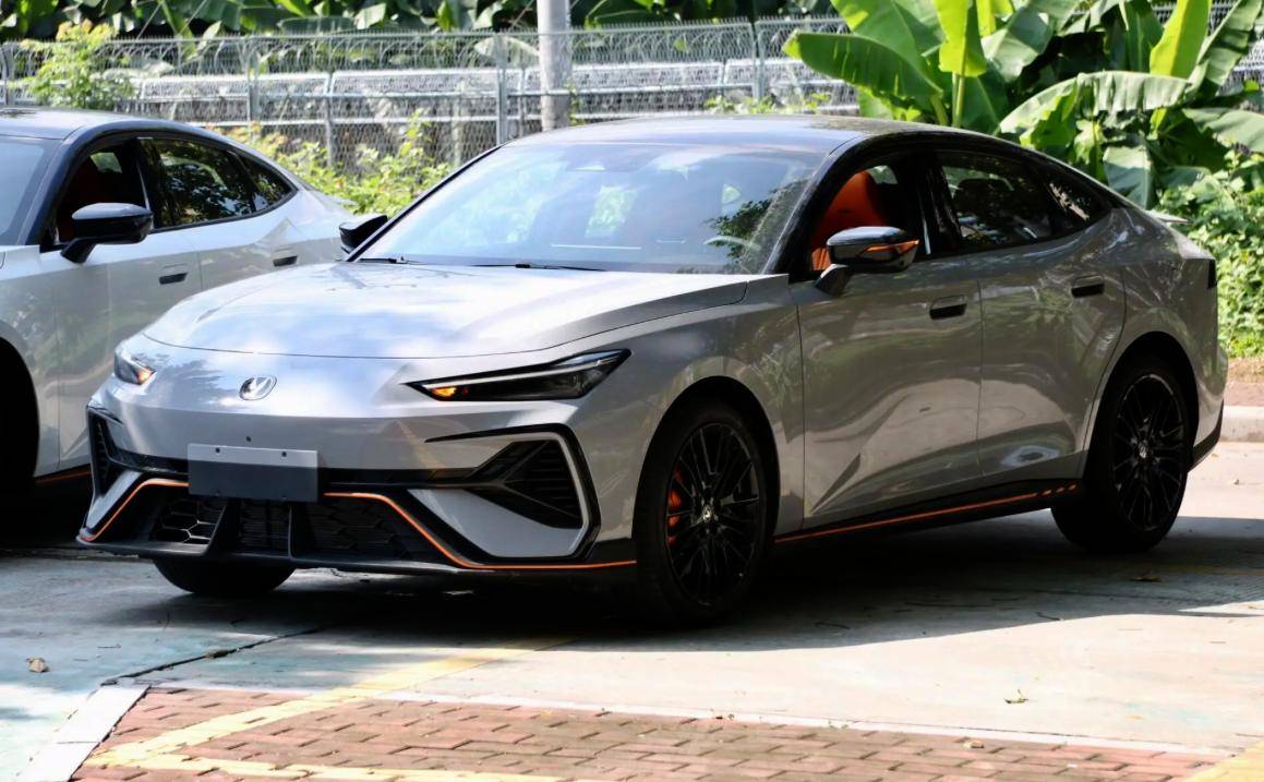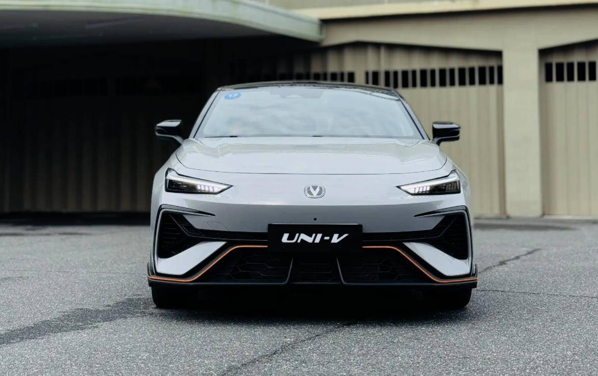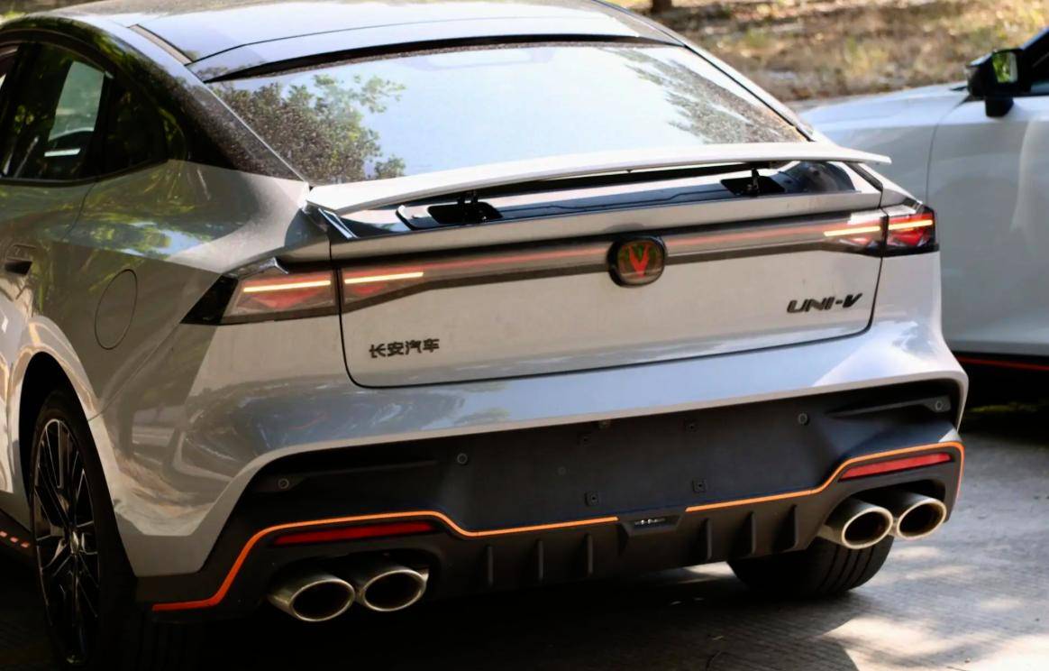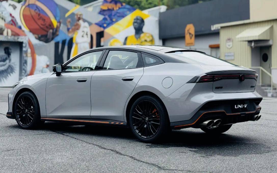 整車線條低趴運動,后半部采用短尾設計,大有遛背跑車的視覺感。車身長度為4740毫米,軸距為2750毫米,與現款UNI-V保持一致。從車頭前唇到側裙再到車尾擴散器設計有一圈橙色裝飾,這是運動版車型的標志套件。車尾配有電動尾翼,后杠還有雙邊四出排氣尾喉。